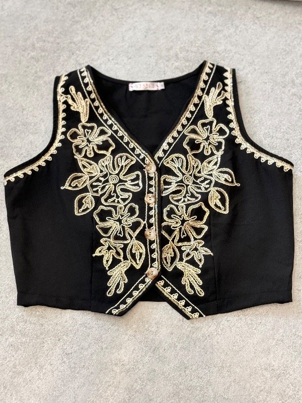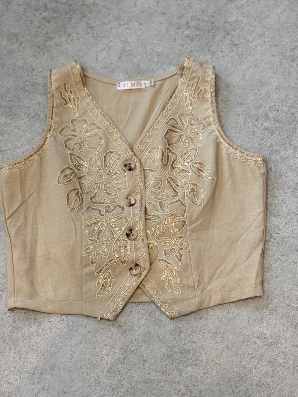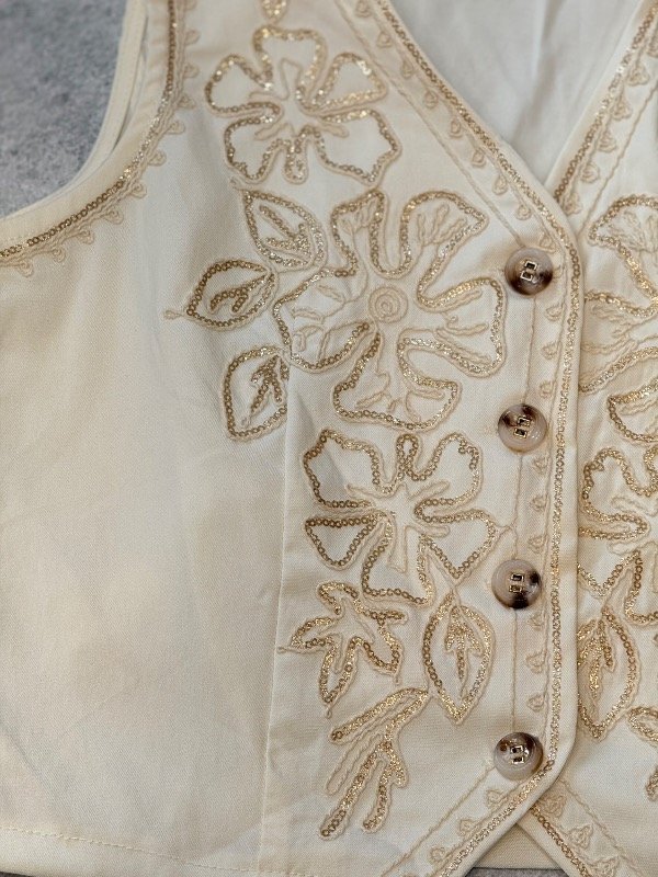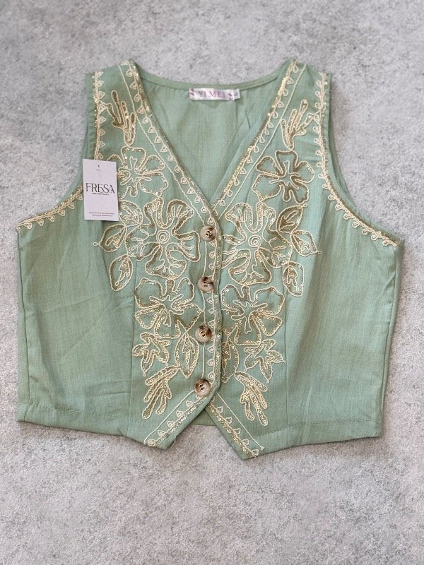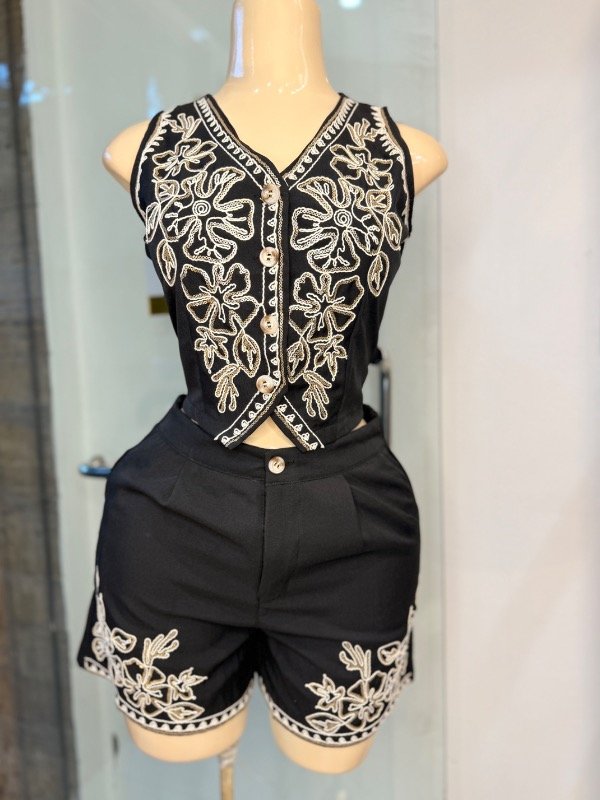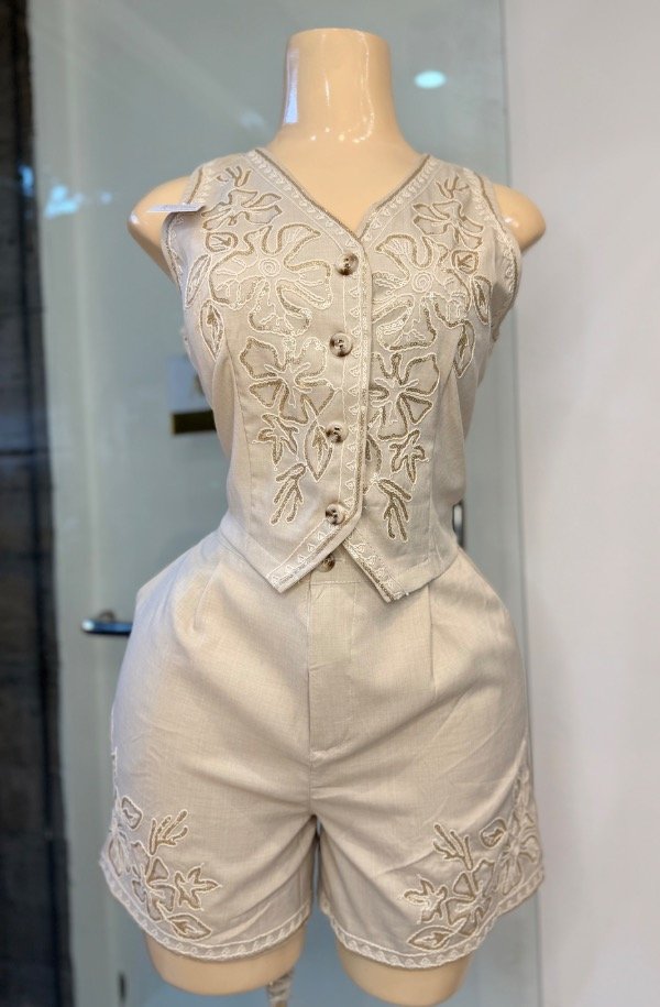 SHORT CON ELASTIZADO EN LA PARTE DE ATRÁS , CHALECO CON AJUSTÉ EN LA CINTURA.