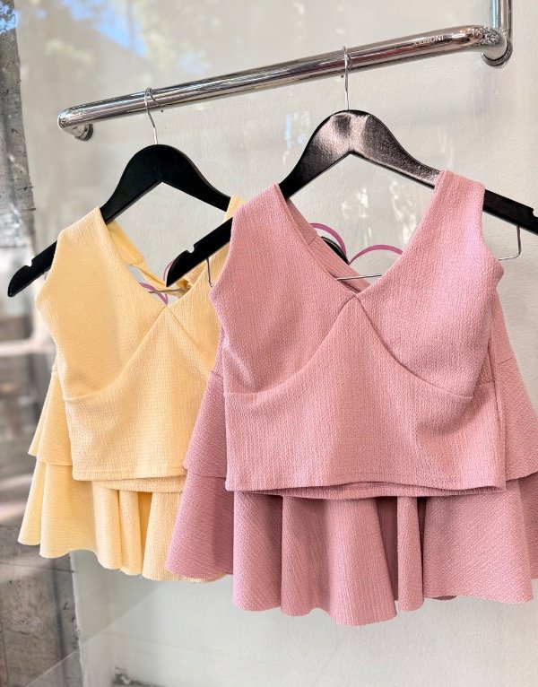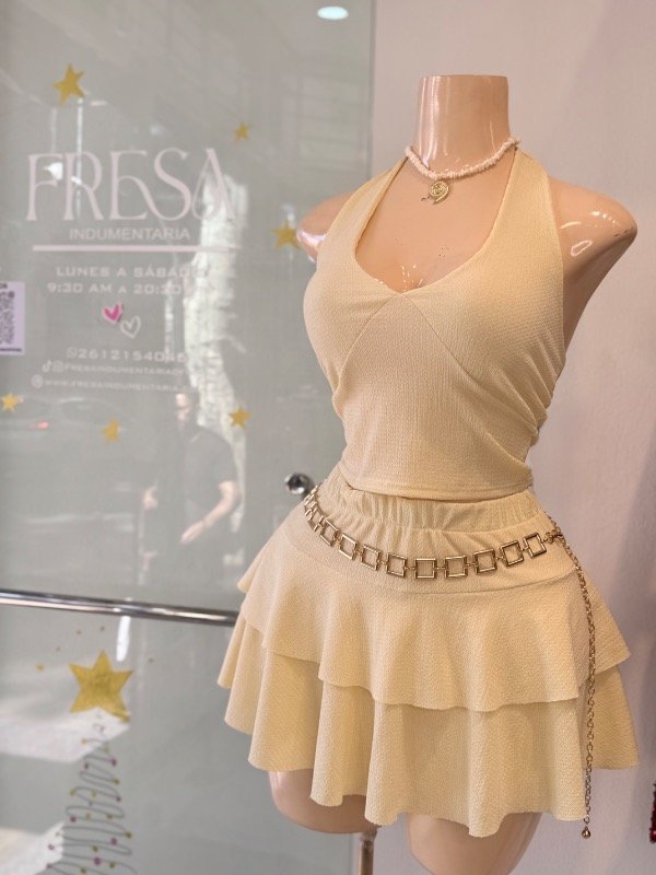 Conjunto top con falda short doble vuelitos, talle único , cede hasta talle 3