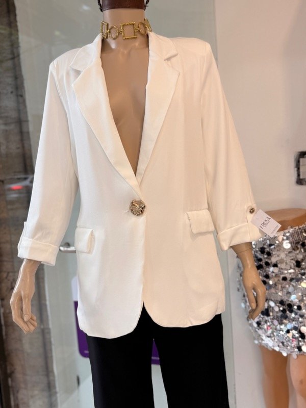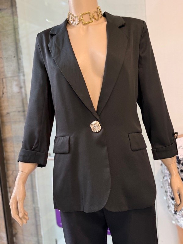 BLAZER CON APLIQUE DORADO , con hombreras , Tipo oversize , manga 3/4 aprox .